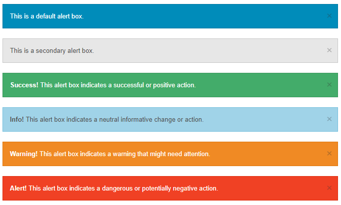 提醒框可以使用 .alert-box 类创建, 可以添加可选的类: .secondary, .success, .info, .warning 或 .alert: