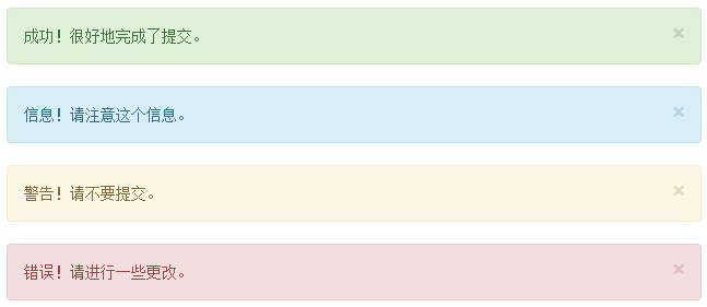 <div class="alert alert-success">成功!很好地完成了提交。</div> <div class="alert alert-info">信息!请注意这个信息。</div> <div class="alert alert-warning">警告!请不要提交。</div> <div class="alert alert-danger">错误!请进行一些更改。</div>