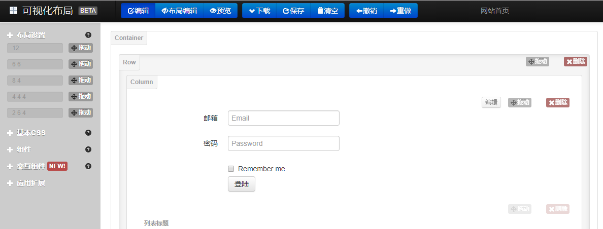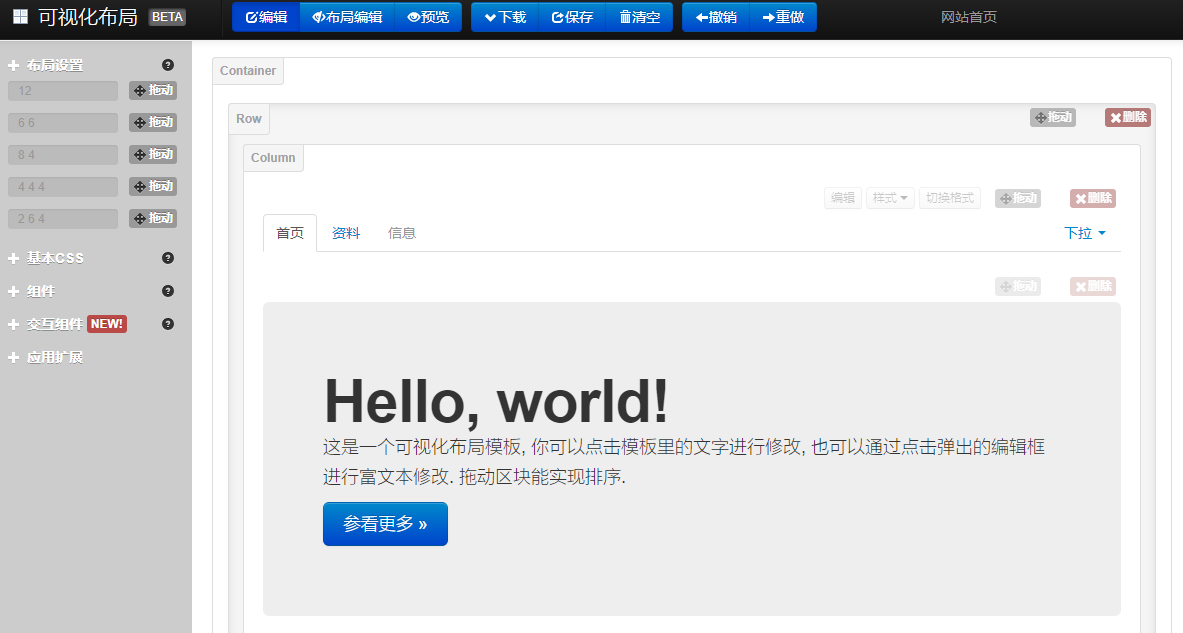 Bootstrap支持一键拖拽的可视化布局,只需要轻轻拖动各种Bootstrap 内置组件,即可轻松完成Web UI界面的搭建(自动生成页面布局代码和相关的JS代特效码)可拖放排序在线编辑的Bootstrap可视化布局系统