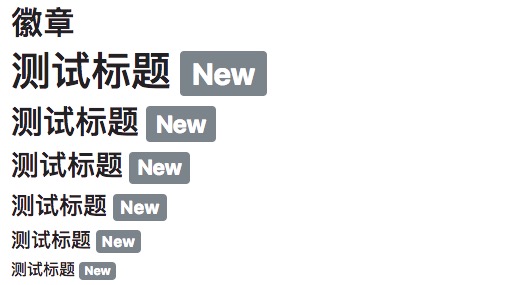 <h1>测试标题 <span class="badge badge-secondary">New</span></h1> <h2>测试标题 <span class="badge badge-secondary">New</span></h2> <h3>测试标题 <span class="badge badge-secondary">New</span></h3> <h4>测试标题 <span class="badge badge-secondary">New</span></h4> <h5>测试标题 <span class="badge badge-secondary">New</span></h5> <h6>测试标题 <span class="badge badge-secondary">New</span></h6>运行结果如下