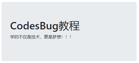 <div class="jumbotron"> <h1>CodesBug教程</h1> <p>学的不仅是技术,更是梦想!!!</p> </div>运行结果如下