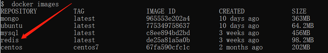 在上图中可以看到我们已经安装了最新版本(latest)的 redis 镜像。