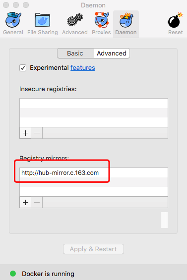 在任务栏点击 Docker for mac 应用图标 -> Perferences... -> Daemon -> Registry mirrors。在列表中填写加速器地址即可。修改完成之后,点击 Apply & Restart 按钮,Docker 就会重启并应用配置的镜像地址了。