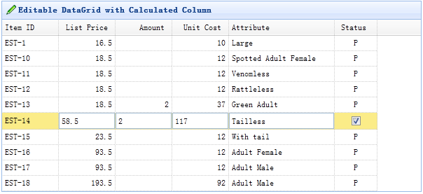 首先,创建一个可编辑的数据网格(datagrid)。这里我们创建了一些可编辑列,'listprice'、'amount' 和 'unitcost' 列定义为 numberbox 编辑类型。运算列是 'unitcost' 字段,将是 listprice 乘以 amount 列的结果。