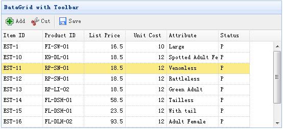 我们不需要写任何的 javascript 代码,只需通过 'toolbar' 属性附加工具栏(toolbar)到数据网格(datagrid)。