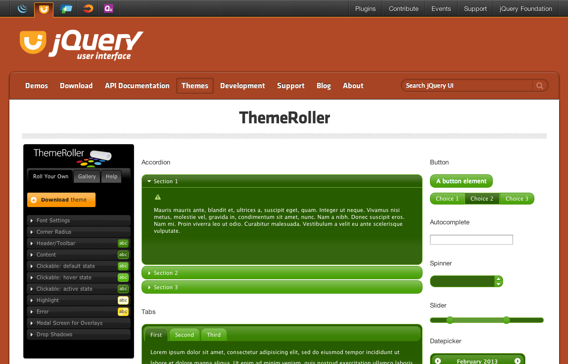 ThemeRoller 为所有使用 jQuery UI 小部件设计的元素提供了一个自定义接口。当您调整左栏中的"levers",右栏中的小部件将根据您的设计进行显示。ThemeRoller 的 Gallery 选项卡提供了一些与设计主题,与下载生成器(Download Builder)页面提供的一样。您可以基于这些主题做调整,或者直接下载。