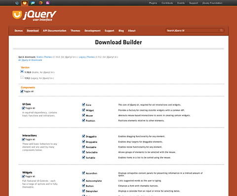 下载生成器(Download Builder)页面的第一栏列出了 jQuery UI 所有的 JavaScript 组件分类:核心(UI Core)、交互部件(Interactions)、小部件(Widgets)和效果库(Effects)。jQuery UI 中的一些组件依赖于其他组件,当选中这些组件时,它所依赖的其他组件也都会自动被选中。您所选的组件将会合并到一个 jQuery UI JavaScript 文件。
