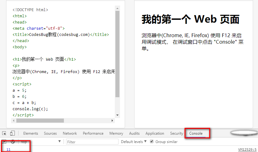 <!DOCTYPE html> <html> <body> <h1>我的第一个 Web 页面</h1> <script> a = 5; b = 6; c = a + b; console.log(c); </script> </body> </html>实例 console 截图: