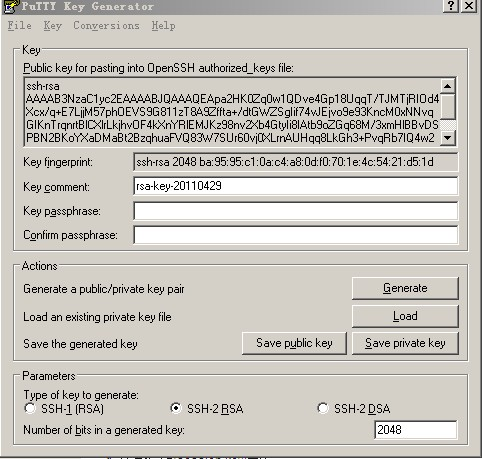 该工具可以生成三种格式的key :SSH-1(RSA) SSH-2(RSA) SSH-2(DSA) ,我们采用默认的格式即 SSH-2(RSA)。Number of bits in a generated key 这个是指生成的key的大小,这个数值越大,生成的key就越复杂,安全性就越高。这里我们写 2048。