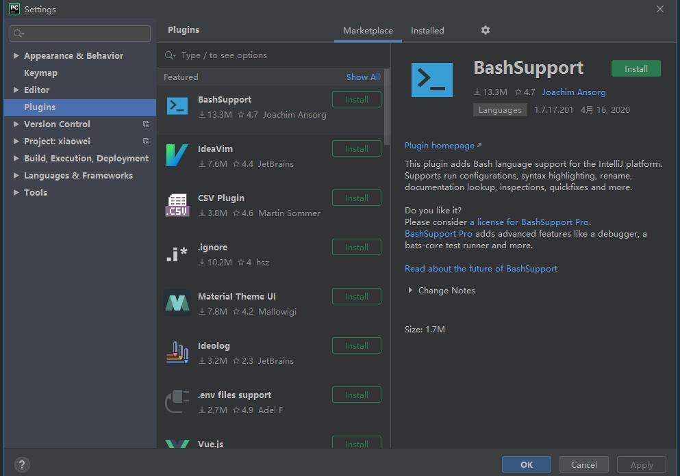 安装 PyCharm 中文插件,打开菜单栏 File,选择 Settings,然后选 Plugins,点 Marketplace,搜索 chinese,然后点击 install 安装:
