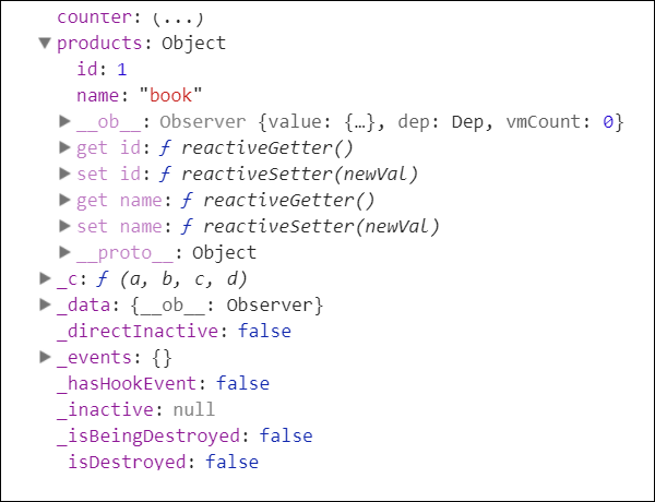 如果我们想给 myproduct 数组添加一个或多个属性,我们可以在 Vue 实例创建后使用以下代码:vm.products.qty = "1";查看控制台输出: